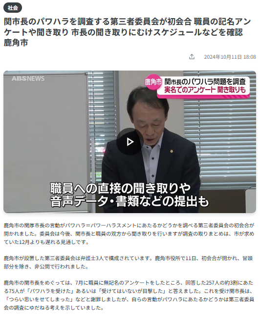 関厚鹿角市長。市職員へのアンケートや聞き取りにより、パワハラを受けた者が多数いることが発覚。2回目の不信任決議を受け、市長選挙が行われる。